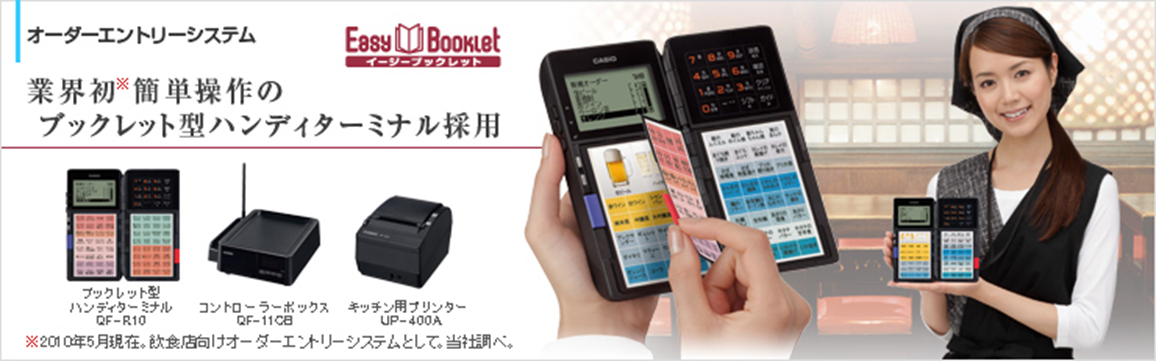 メニューのダイレクト入力を可能にした、 業界初※のブックレット型ハンディターミナルを搭載。 徹底した簡単操作が、アルバイトなど初めての方も即戦力に。 「カシオ オーダーエントリーシステム」は、 ローコスト経営&売上アップへ速やかに貢献します。