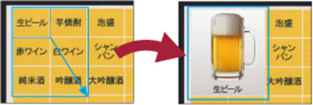 例えば4つのキーをまとめて1つのボタンに設定。”生ビール”など人気メニューを大型化して利便性をさらに向上。写真の利用もできます。