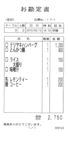 テーブルメニューと同様のページ方式で、1キー1メニューの簡単オペレーションを実現。 メニュー数も通常で192メニュー、シフトを使用すれば384メニューまで登録可能です。 ブックレット型ハンディターミナルならではの優れた操作性や使い勝手が、業務の効率化を促進するとともに、サービス向上、店舗の評判アップにも貢献します。